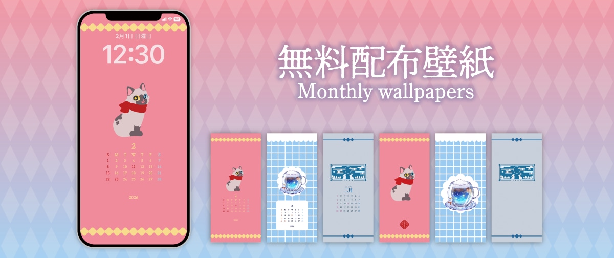 オリジナルデザイン全6種の中からお好きな壁紙をお選びいただき、画像長押しでダウンロードできます。